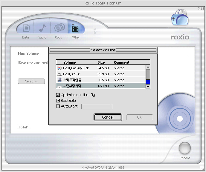 두번째그림처럼 맥볼륨으로 선택하신후 부트테이블에 체크하시고 구우시면 됩니다^^
